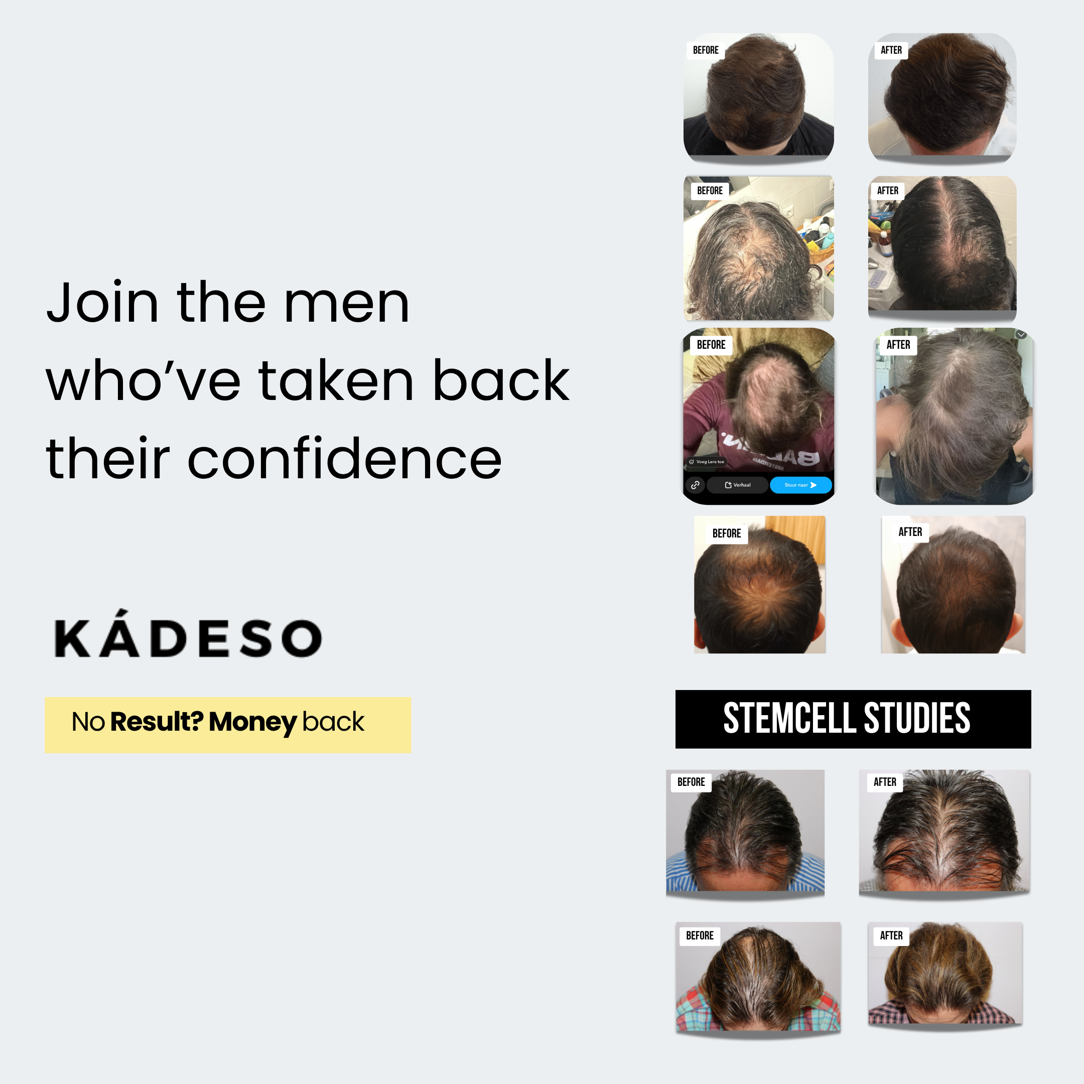 KÁDESO’s patented stem cells and natural DHT blockers tackle every cause of hair loss. Restoring thicker hair by boosting blood flow, scalp nutrition and root hydration. All in 30 seconds daily.